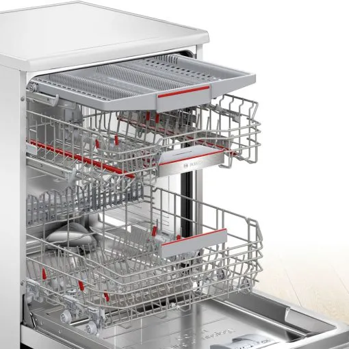 یکی از ظرفشویی های سری 6 ساخت آلمان که دارای قابلیت ها و ویزگی های کاربردی می باشد، ماشین ظرفشویی بوش مدل SMS6ZCW85 است. این ظرفشویی بدنه ای به رنگ سفید دارد که با هر آشپزخانه ای ست می شود و درب دستگاه به سمت پایین با زاویه 90 درجه باز می شود.